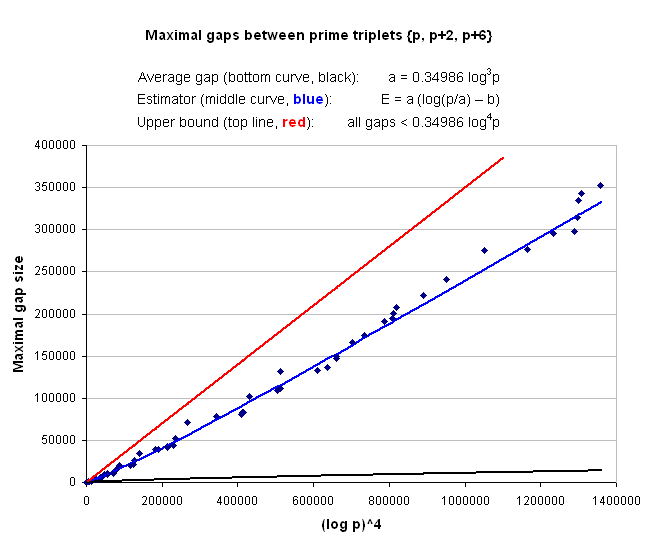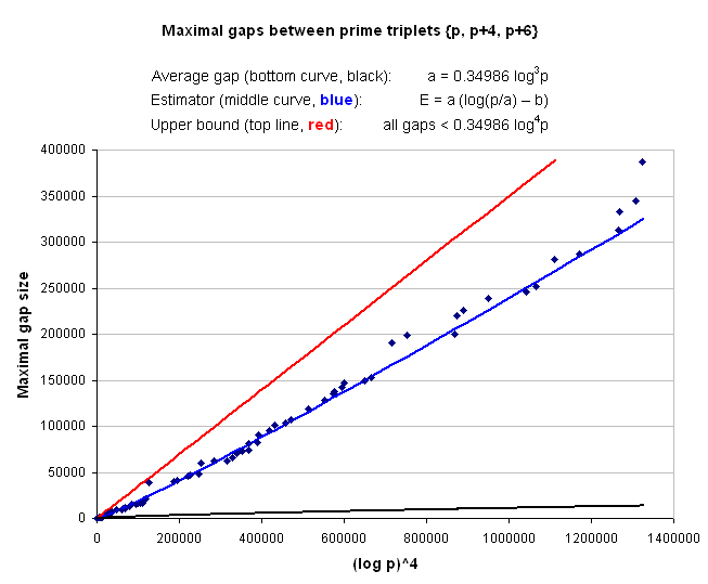 Maximal gaps between prime triplets of each type are listed below.